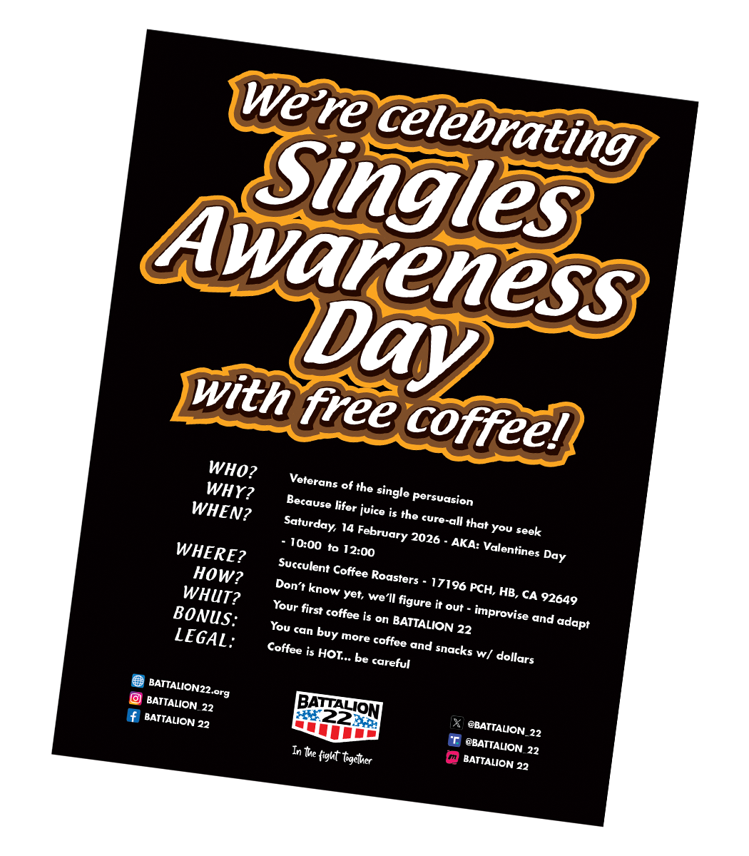 No better way to get to know BATTALION 22 than with some FREE coffee! Join us from 10:00 to noon at Succulent Coffee Roasters (17196 Pacific Coast Hwy, Huntington Beach, CA 92649) for some hot and delicious conversation. Seriously, this is going to be a lovely time!! DON’T MISS OUT!!